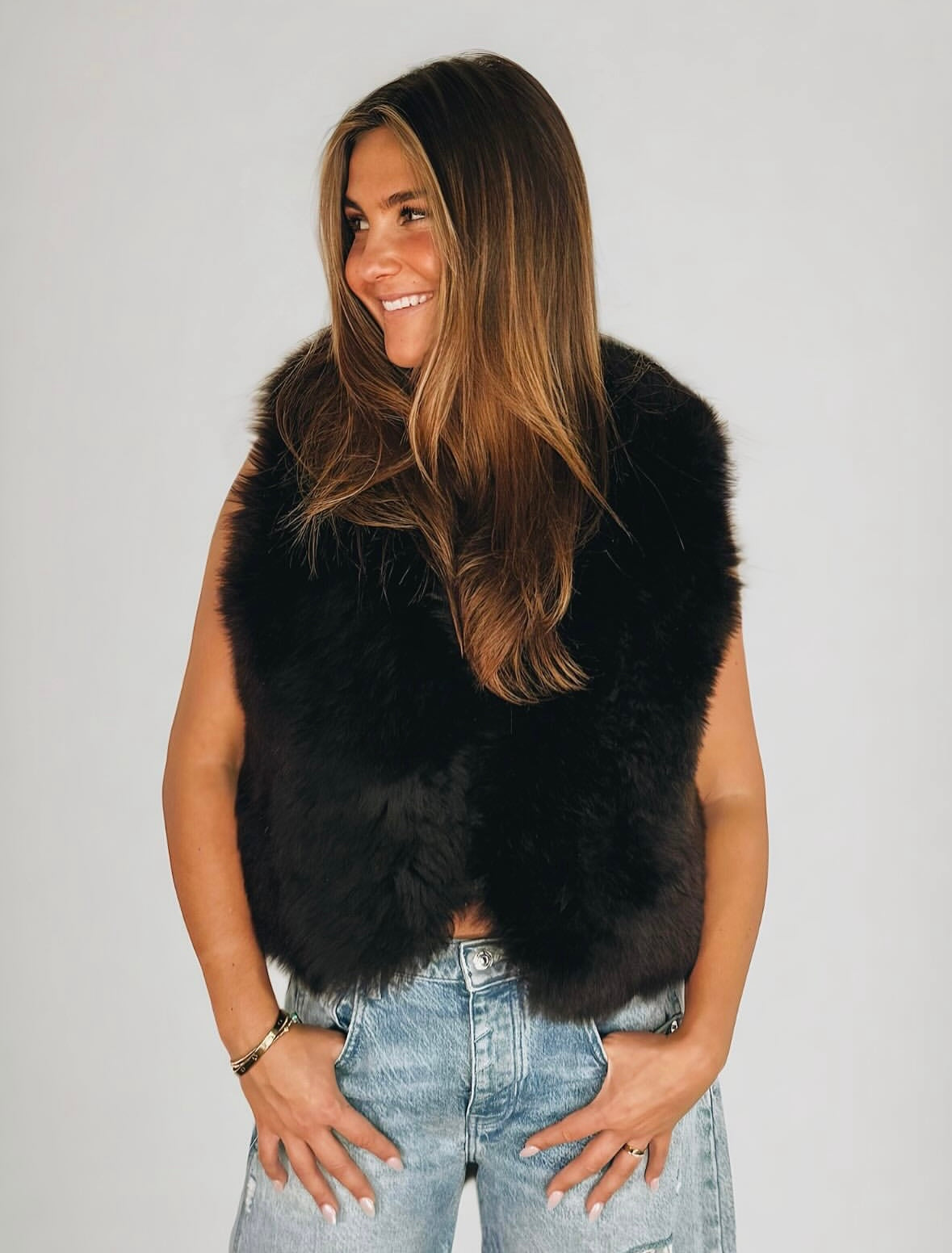 Crafted from sumptuously soft, dark brown shearling, this vest exudes effortless style and cozy comfort. The plush texture adds a touch of elegance, while the sleeveless design makes it a versatile layering piece for any season. Wrap yourself in timeless sophistication and unparalleled comfort with this must-have shearling vest!