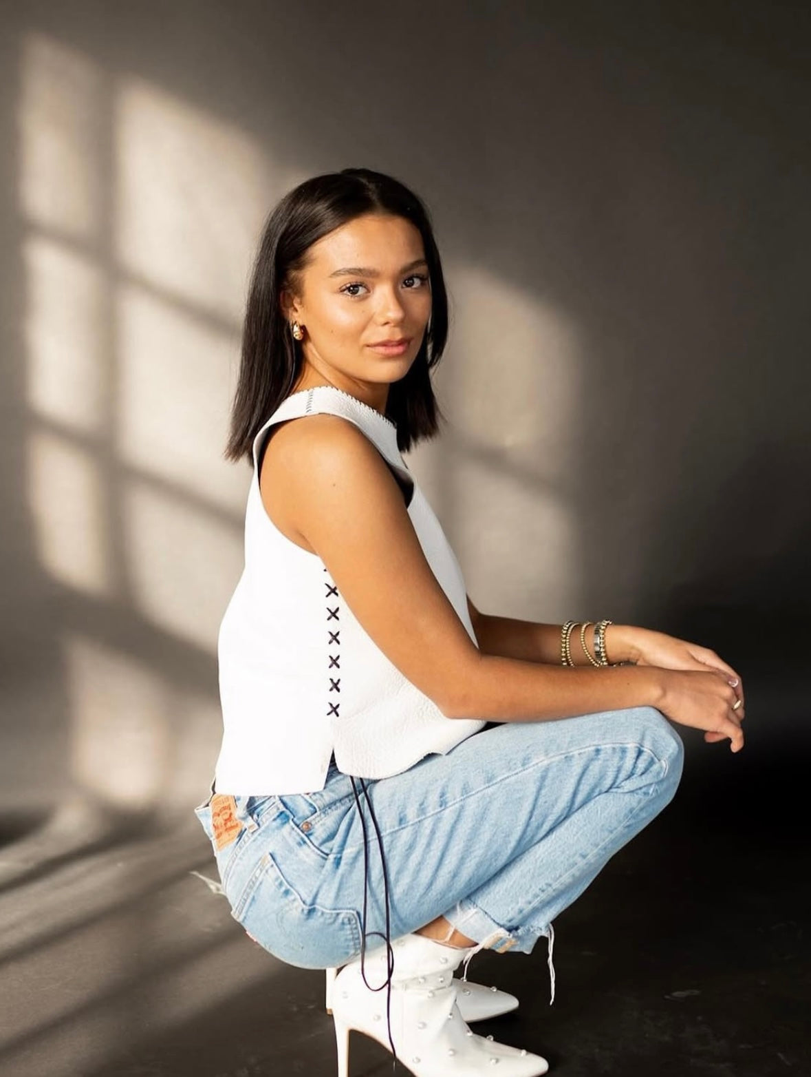 Whether you're aiming for a casual daytime vibe or a more dressed-up evening look, this tank top is a standout piece that will elevate your wardrobe. This chic, sleeveless tank top offers a fresh and stylish look. Crafted from a textured white fabric, it features a unique design with black crisscross stitching along the side seams, adding a touch of edgy detail. The slightly cropped silhouette and clean neckline make it versatile for pairing with high-waisted jeans, skirts, or shorts.